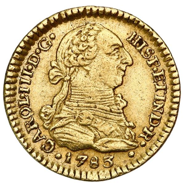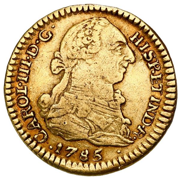Popayan, Colombia, gold bust 1 escudo, Charles III, 1785 SF. Restrepo-54.28; KM-49.2a; Cal-1430. 3.32 grams. VF, a few thin marks on bust.