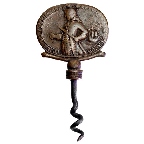 Great Britain, oval copper alloy Admiral Vernon medal, 1739, Vernon and ship / Porto Bello, made into a corkscrew, rare, ex-Adams. AC-PBvi25OO. 15.27