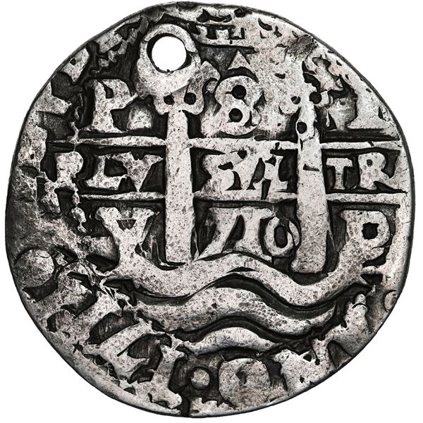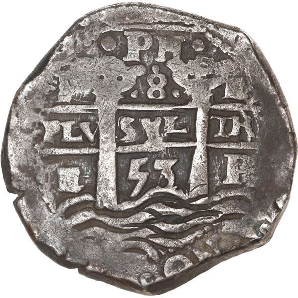 BOLIVIA, Potosí, cob 8 reales, 1653 E, •PH• at top, •pomegranate• above cross, ex-Woodside.1037 - BOLIVIA, Potosí, cob 8 reales, 1653 E, •PH• at top, •pomegranate• above cross, ex-Woodside.