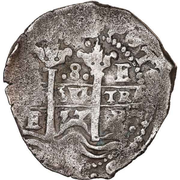BOLIVIA, Potosí, cob 8 reales, 1657 E, no PH at top, denomination •8• above cross.1040 - BOLIVIA, Potosí, cob 8 reales, 1657 E, no PH at top, denomination •8• above cross.