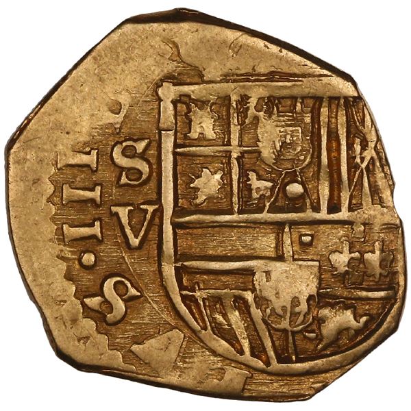 SPAIN, Seville, gold cob 2 escudos, Philip III, assayer V. Cal-Type 197; KM-20; Fr-189. 6.72 grams. About AU with cylindrical test-mark on edge, clear