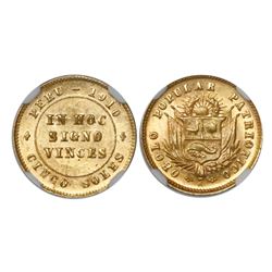 Peru, 5 soles gold token, 1910, "Obolo Popular Patriotico," encapsulated NGC MS 63. KM-Tn2. 15 mm. Arms on obverse, IN HOC SIGNO VINCES on...