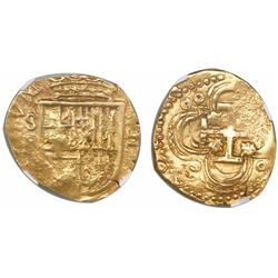Seville, Spain, cob 4 escudos, Philip III, assayer not visible, encapsulated NGC AU 58. 13.2 grams. Very bold full shield and cross but no peripheral