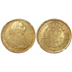 Santiago, Chile, bust 8 escudos, Charles III, 1786DA, encapsulated NGC AU 58. CT-246; KM-27. Lustrous and well struck, a few minor marks only, tied f