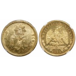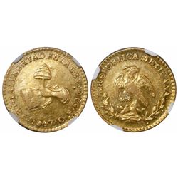 Culiacan, Mexico, 1 escudo, 1847CE, encapsulated NGC AU 58, finest and only specimen in NGC census. KM-379, Fr-98. Good luster, decent strike except
