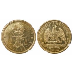 Mexico City, Mexico, 20 pesos, 1882/1M, encapsulated NGC MS 63, finest known in NGC census. KM-414.6, Fr-119. Nice luster and good strike, faint hair