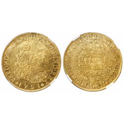 Seville, Spain, milled 8 escudos, Philip V, 1704P, "8 S 8 P" variety, encapsulated NGC MS 62. CT-162; KM-260. Bold strike with slightly g...