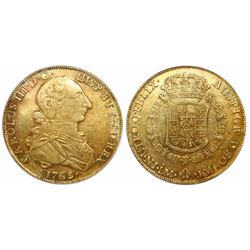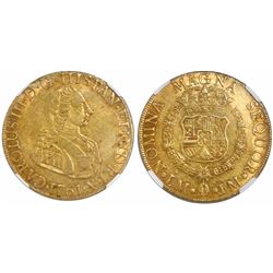Lima, Peru, bust 8 escudos, Charles III (small young bust, "rat nose"), 1761JM, encapsulated NGC AU 55. CT-9; KM-68. Nice strike, light t...