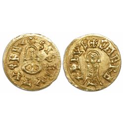 Visigoths (Spain), AV tremissis, Sisebut (612-621 AD), Emerita mint (Merida, Badajoz). Cay-216. 1.50 grams. Bold, broad-flan AU with slight weakness o