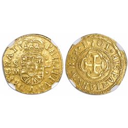 Segovia, Spain, milled 1 escudo, Philip III, 1607C, king's name as PHILIP, rare, encapsulated NGC MS 65, finest known in NGC census. CT-60; KM-2...