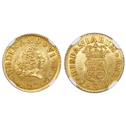 Madrid, Spain, bust 1/2 escudo, Ferdinand VI, 1747JB, encapsulated NGC MS 64. CT-242; KM-372. Very bold strike (especially the bust) with clean, lust