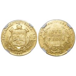 Costa Rica, 2 pesos, 1867GW, NGC VF 25. KM-113. Lustrous XF in our estimation, with die-cracks on shield side and marks in field on other side. NGC #