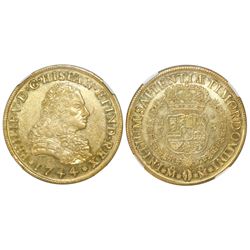 Mexico City, Mexico, bust 8 escudos, Philip V, 1744MF, NGC MS 61, Bevill Plate. CT-140; KM-148. Brightly lustrous and well struck, with light hairlin