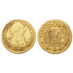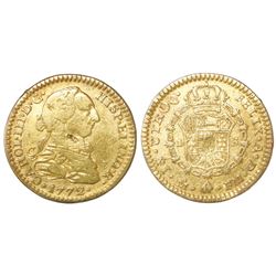 Mexico City, Mexico, bust 1 escudo, Charles III, 1772FM, initials facing rim. CT-648; KM-118.1. 3.30 grams. Decent XF with unfortunate gouges in bust