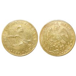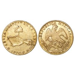 Guanajuato, Mexico, 8 escudos, 1870FR. KM-383.7. 27.00 grams. AU with original luster, minor (natural) flaw in cap, faint toning around details.