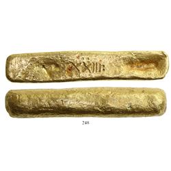Small, flat Peruvian gold bar #35, 410 grams, marked with fineness XXIII: (23.5K) and assayer MOSQVERA and foundry CVZCO, from the Santa Margarita (16