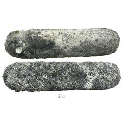 Small, contraband silver bar, 679 grams, from the Maravillas (1656), encrusted. 5-1/2" x 1-1/2" x 1-1/8". Typical "finger"...