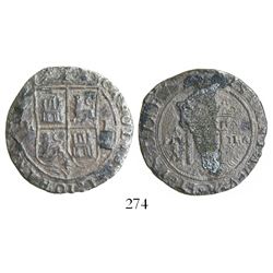 Lima, Peru, cob 4 reales, Philip II, assayer Diego de la Torre, P-4 to left, *-oD to right, Grade 2. S-L4; KM-11; CT-318. 13.00 grams. Very broad flan