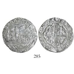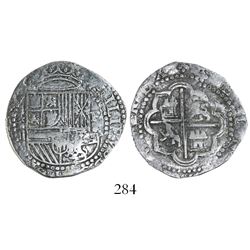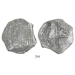 Potosi, Bolivia, cob 8 reales, Philip II, assayer RL, Grade 1. S-P13; KM-5.1; CT-159. 24.58 grams. Bold full crown and shield and cross and P-RL with