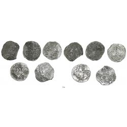 Lot of 10 Potosi, Bolivia, cob 8 reales, Philip II and/or III, various assayers (where visible), all Grade 1. Generally good shields and crosses, mo
