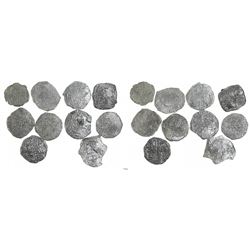 Lot of 10 Potosi, Bolivia, cob 8 reales, Philip II and/or III, various assayers (where visible), all Grade 3. Generally moderately corroded but stil