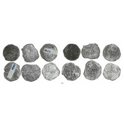 Lot of 6 Potosi, Bolivia, cob 8 reales, Philip II and/or III, various assayers (where visible), all Grade 2. Generally lightly corroded (some better