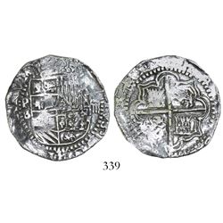 Potosi, Bolivia, cob 4 reales, Philip III, assayer Q, Grade 2. S-P17; KM-9; CT-243. 12.00 grams. Good full shield and cross, clear P-Q and denominatio