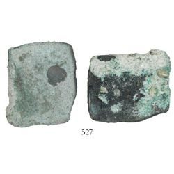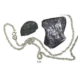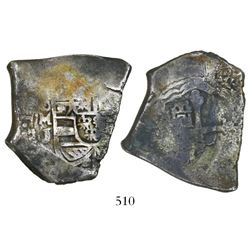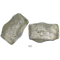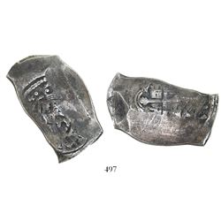 Lot of 2 Mexico City, Mexico, cob 8 reales, Philip V, assayers not visible. 42.04 grams. Mostly solid but corroded, clear shields and crosses, one wi