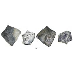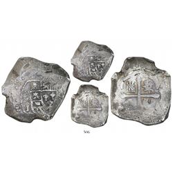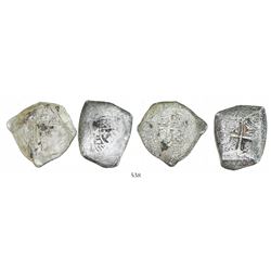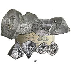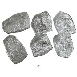 Lot of 7 Mexico City, Mexico, cob 8R (6, one encrusted) and 4R (1), Philip V, assayer J (where visible). 128.73 grams total. Generally moderately cor