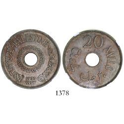 Palestine, copper-nickel 20 mils, 1941, key date, encapsulated NGC MS 62. KM-5. Dull toning but choice grade (very rare thus), a few marks here and t