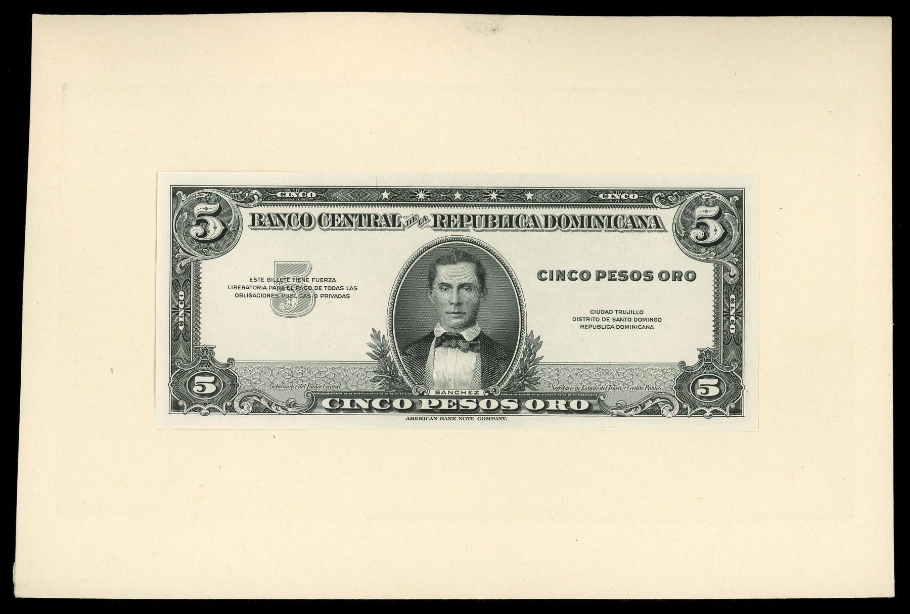 Trujillo City, Dominican Republic, 5 pesos oro obverse proof, no date (1947). SCWPM-61p. Scarce proof mounted on cardstock, no problems.