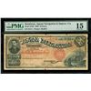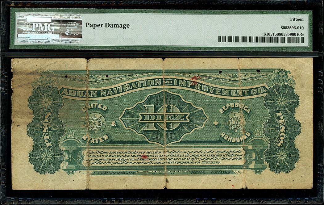Trujillo, Honduras, Aguan Navigation and Improvement Company, 10 pesos, 25-6-1886, serial B111, PMG Choice Fine 15. SCWPM-S105. The Aguan Navigation & Improvement Company attempted to build an Atlantic-Pacific canal through Honduras, but folded before the project could be realized. Higher denomination notes from the company are scarce. PMG holder notes paper damage in the form of some edge damage and four small holes at the top, some small red stains noted, good ink color and interesting "111" serial number. PMG #8053596-010.