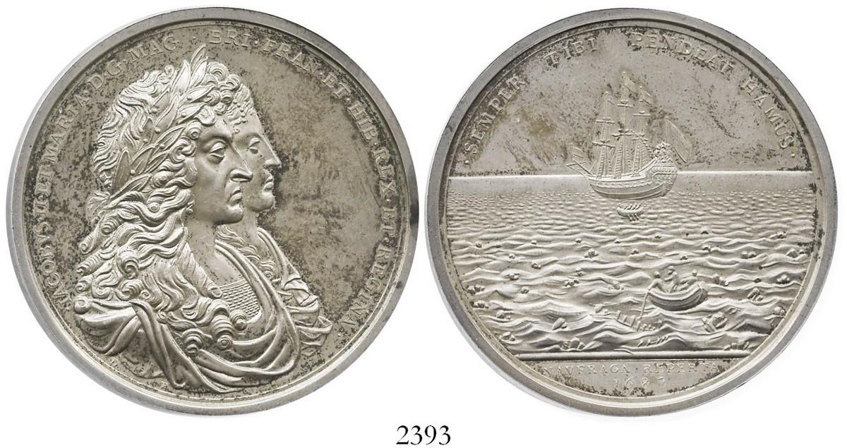 Turks and Caicos Islands, silver restrike (ca. 1970) of the British Phipps medal of 1687. 107.7 grams. Lustrous Mint State with incipient toning, scarce in its own right due to large-scale silver melting in the 1970s, the original struck to commemorate the salvaging of the Spanish shipwreck Concepcion (1641) wreck by New Englander William Phipps.