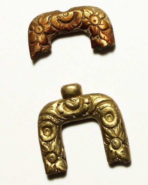 Two pieces of an ornate gold watch fob, English, ca. 1760. 3.7 grams, 1/2". Floral design in rectangular shape, fairly bright gold with some green spots.