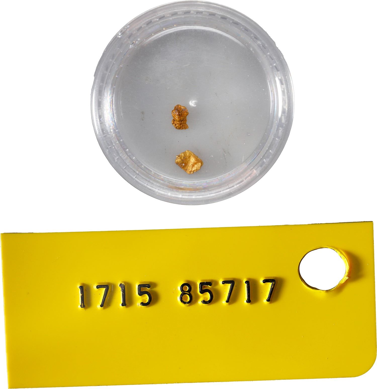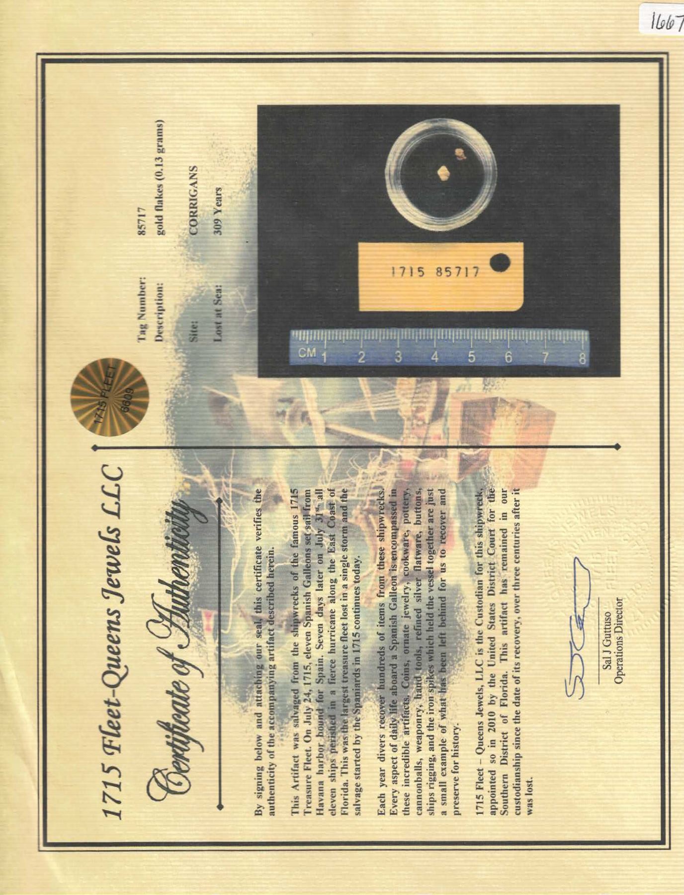 Two tiny natural gold flakes, 0.13 gram, ex-1715 Fleet, ex-Queens Jewels. Two little gold nuggets in a circular plastic box, accompanied by the plastic salvage tag. From the Corrigans site of the 1715 Fleet, with original Queens Jewels plastic tag and photo-certificate 85717. SOLD FOR THE BENEFIT OF THE 1715 FLEET SOCIETY.