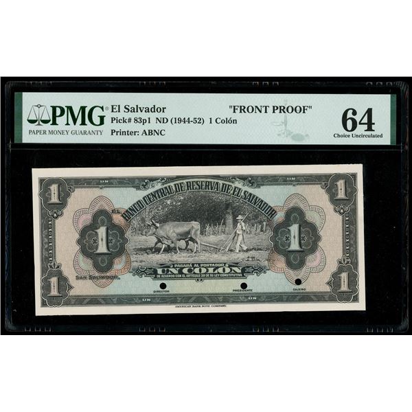 San Salvador, El Salvador, Banco Central de Reserva, 1 colon front proof, (1944-52), PMG Choice UNC 64, finest known in the PMG census. SCWPM-83p1. Ch