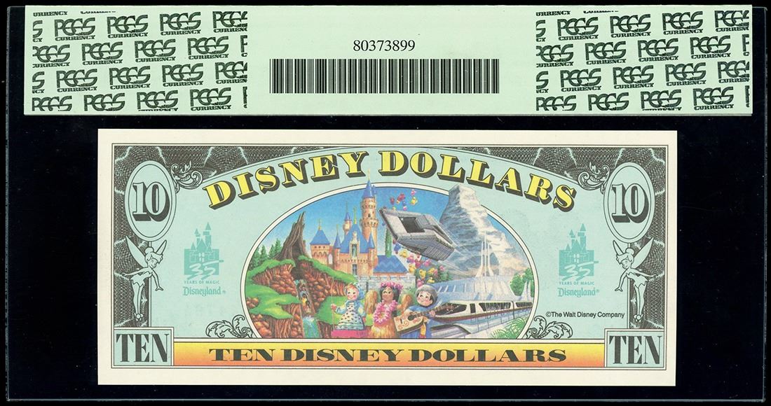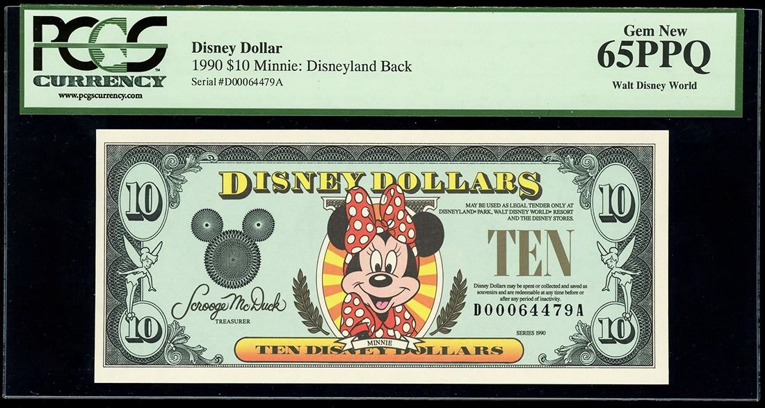 UNITED STATES, 10 Disney dollars, 1990, D00064479A, Minnie Mouse / Disneyland, PCGS Currency Gem New 65 PPQ, ex-Busto. Rodgers-R-020. "Oh, toodles!" - Minnie Mouse. Colorful note with nice centering and paper quality. Pedigreed to the José Busto Collection.