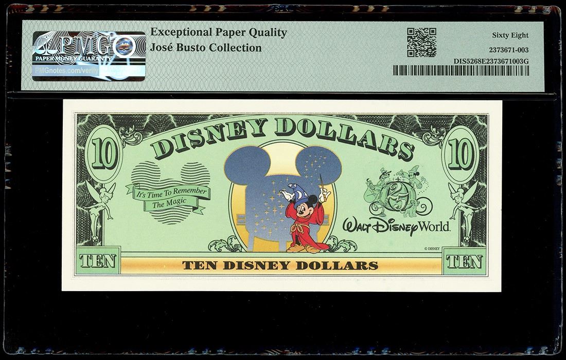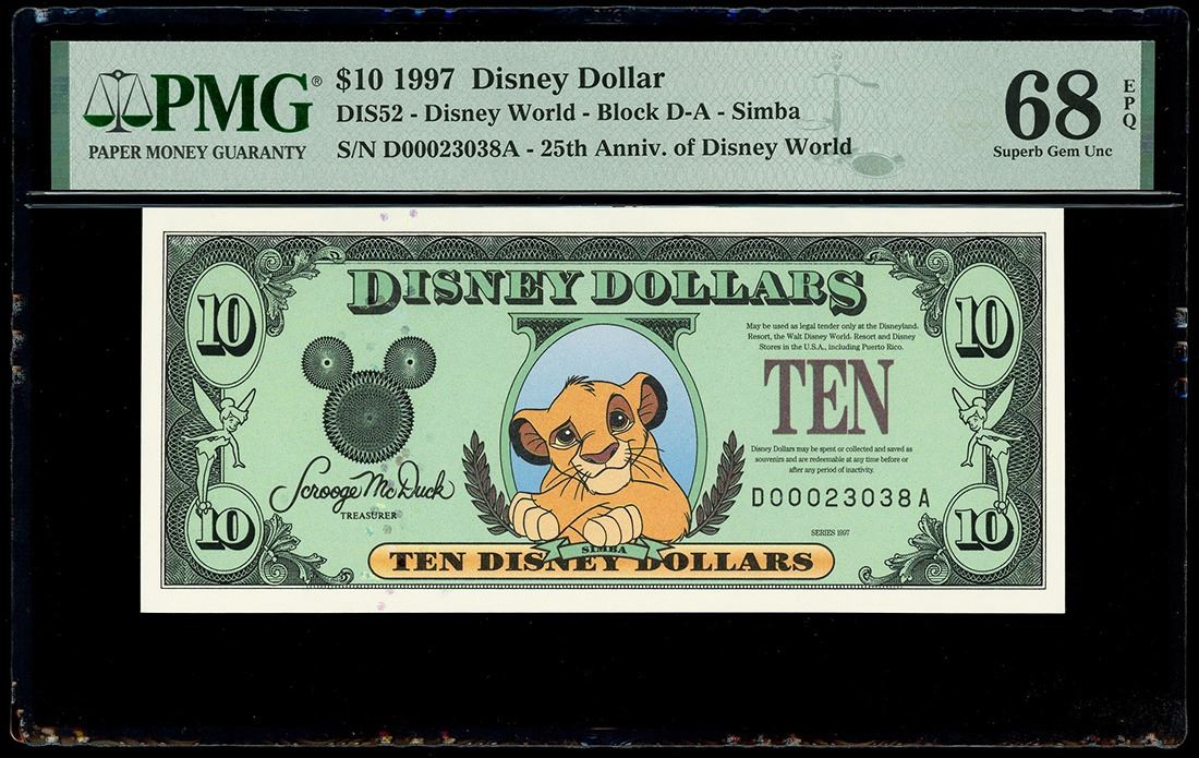 UNITED STATES, 10 Disney dollars, 1997, serial D00023038A, Simba / 25th Anniversary of Disney World, PMG Superb Gem UNC 68 EPQ, finest known in PMG census, ex-Busto. Rodgers-R-052. Spectacular example of this rare $10 issued by Disney featuring Simba on the front and commemorating the 25th anniversary of Disney World on the back. The 1997 $10 was issued in limited numbers and many were redeemed or mishandled over the years, leaving very few choice UNC examples and even fewer gem UNCs. This note features great centering and margins, excellent ink color and paper quality, and strong embossing on the serial number. Pedigreed to the José Busto Collection (stated on label).