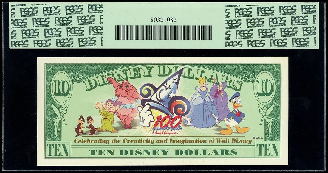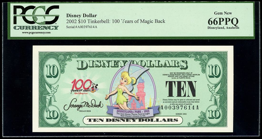 UNITED STATES, 10 Disney dollars, 2002, serial A00397614A, Tinkerbell / 100 Years of Magic, PCGS Currency Gem New 66 PPQ, ex-Busto. Rodgers-R-079. Scarce Disney type note featuring Tinkerbell on the front and the "100 Years of Magic" back with several famous characters. Gem example with great paper quality and centering. Pedigreed to the José Busto Collection.