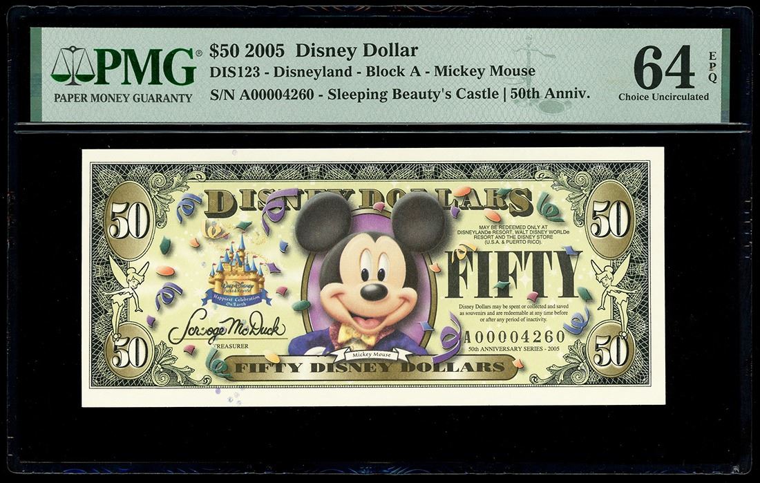 UNITED STATES, 50 Disney dollars, 2005, serial A00004260, Mickey Mouse / 50th Anniversary of Disneyland, rare, PMG Choice UNC 64 EPQ, ex-Busto. Rodgers-R-123. The highest Disney dollar denomination issued, this $50 is one of two designs released in 2005 to commemorate the 50th anniversary of Disneyland. Nicely centered note with good margins and paper quality. Pedigreed to the José Busto Collection (stated on label).