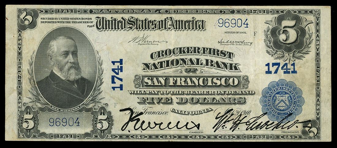 UNITED STATES, Crocker First National Bank of San Francisco, $5 National Bank Note, series of 1902, serial 96904, Vernon-McClung, Ch. # 1741. Fr-601. Boldly signed example of a $5 National issued by this prominent San Francisco bank. VF, a few tiny rust spots in left margin.