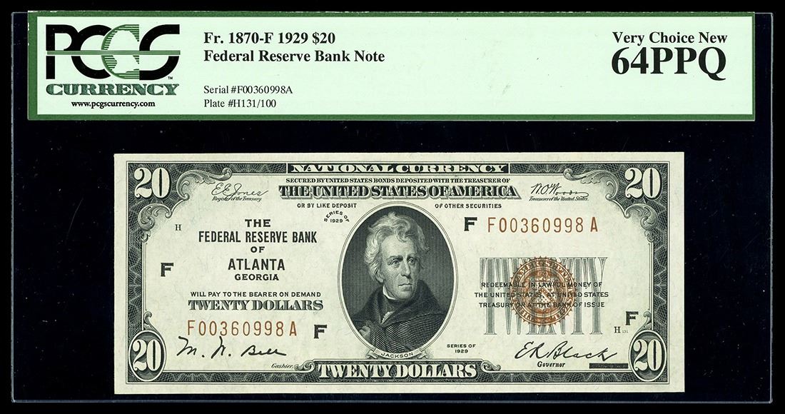 UNITED STATES, FRB of Atlanta, $20, series of 1929, serial F00360998A, Jones-Woods, PCGS Currency Very Choice New 64 PPQ. Fr-1870-F; KL-2267. Nicely centered Atlanta $20 with bold printing and nice paper quality.