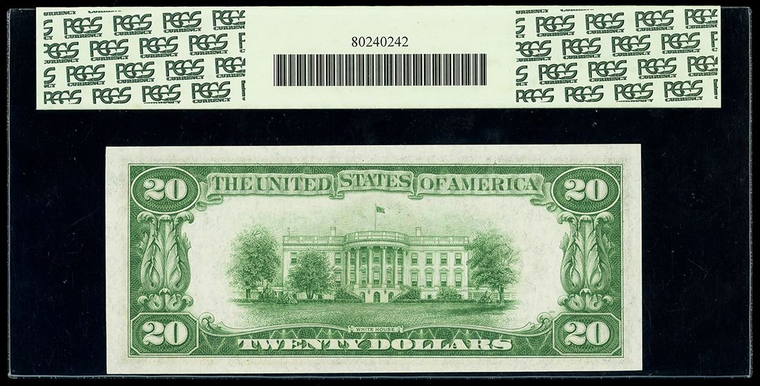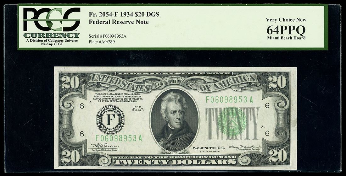 UNITED STATES, Federal Reserve Bank of Atlanta, $20 Federal Reserve note, series of 1934, serial F06098953A, Julian-Morgenthau, dark green seal, PCGS Currency Very Choice New 64 PPQ, ex-Miami Beach Mansion Hoard. Fr-2054-F. In 2009, a contractor renovating a classic Miami Beach mansion found a hoard of banknotes hidden in a wall. The group consisted of 1930s-era Federal Reserve notes and silver certificates, many of them in original packs, wrapped in cloth and tucked into the wall. Apparently, the original owners of the house had stored the money away for safekeeping but never told anyone. Well-printed $20 with great, as-made quality. Pedigreed to the Miami Beach Hoard.