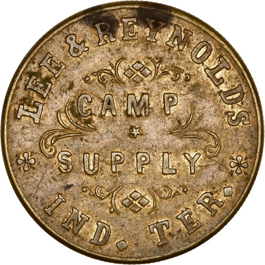 UNITED STATES, Indian Territory, brass 1 dollar "good for" token, no date (ca. 1873-1881), Lee & Reynolds. Rulau-unl. 6.48 grams. 25 mm. Popular Indian Territory token for use as one dollar in trade at Camp Supply where Lee & Reynolds operated their trading post from 1873 to 1881. XF+ with some luster around the lettering, two small dark spots at top.