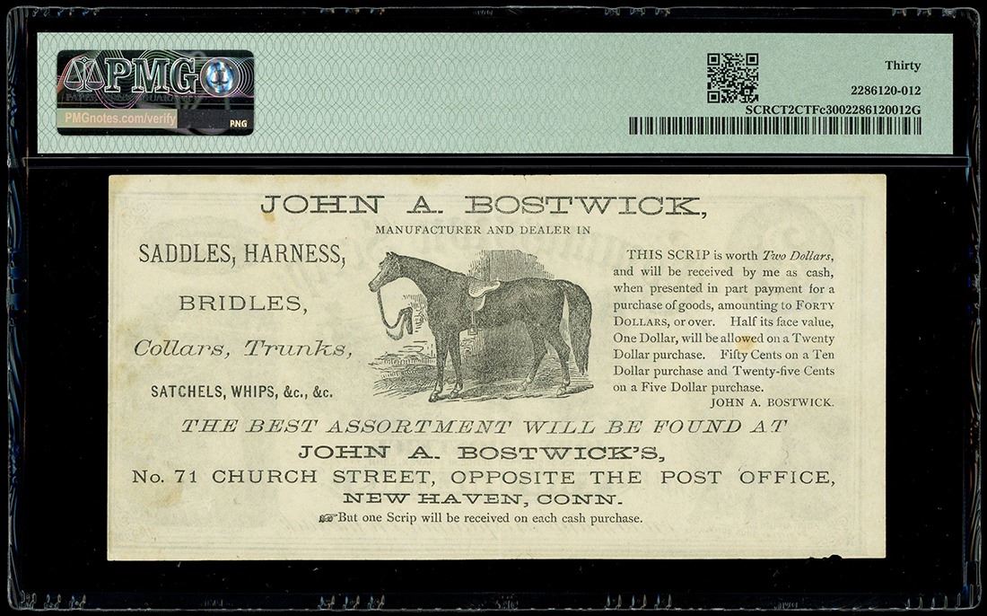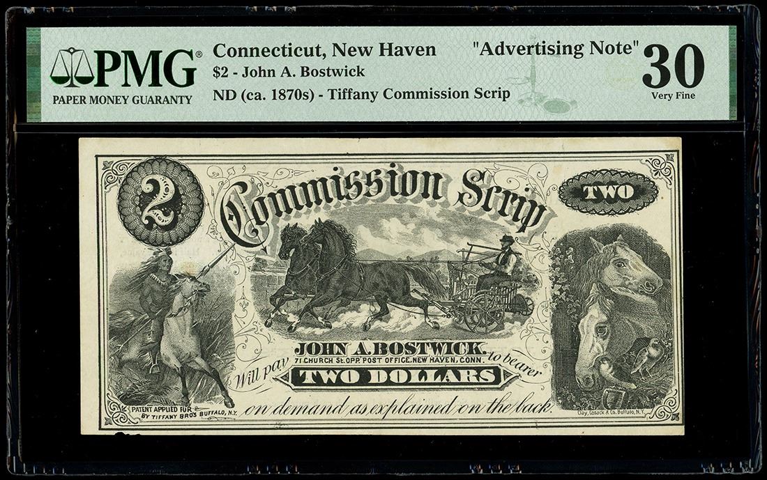 UNITED STATES, New Haven, Connecticut, $2, ca. 1870s, Tiffany Commission Scrip of John A. Bostwick "advertising note," PMG VF 30. Very rare Tiffany Commission Scrip note issued by John A. Bostwick of New Haven, Connecticut, who is self-described as "manufacturer and dealer in saddles, harness, bridles, collars, trunks, satchels, whips, &c., &c." This scrip note, when presented for a purchase, entitled the bearer to $2 off an order of $40 or a reduced discount for smaller purchases. Boldly printed with several vignettes of horses across the face, only a small tear in the lower left margin to note.