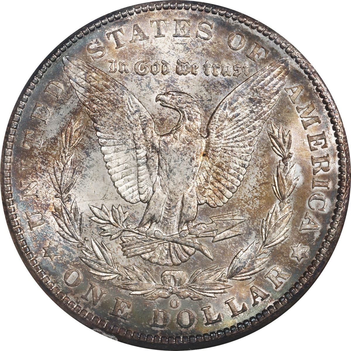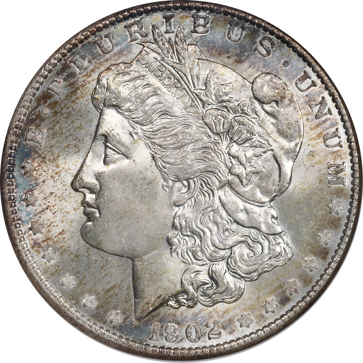 UNITED STATES, New Orleans mint, Morgan dollar, 1902-O, ANACS MS 64, ex-Busto. Lustrous surfaces with nice rainbow toning. Pedigreed to the José Busto Collection.