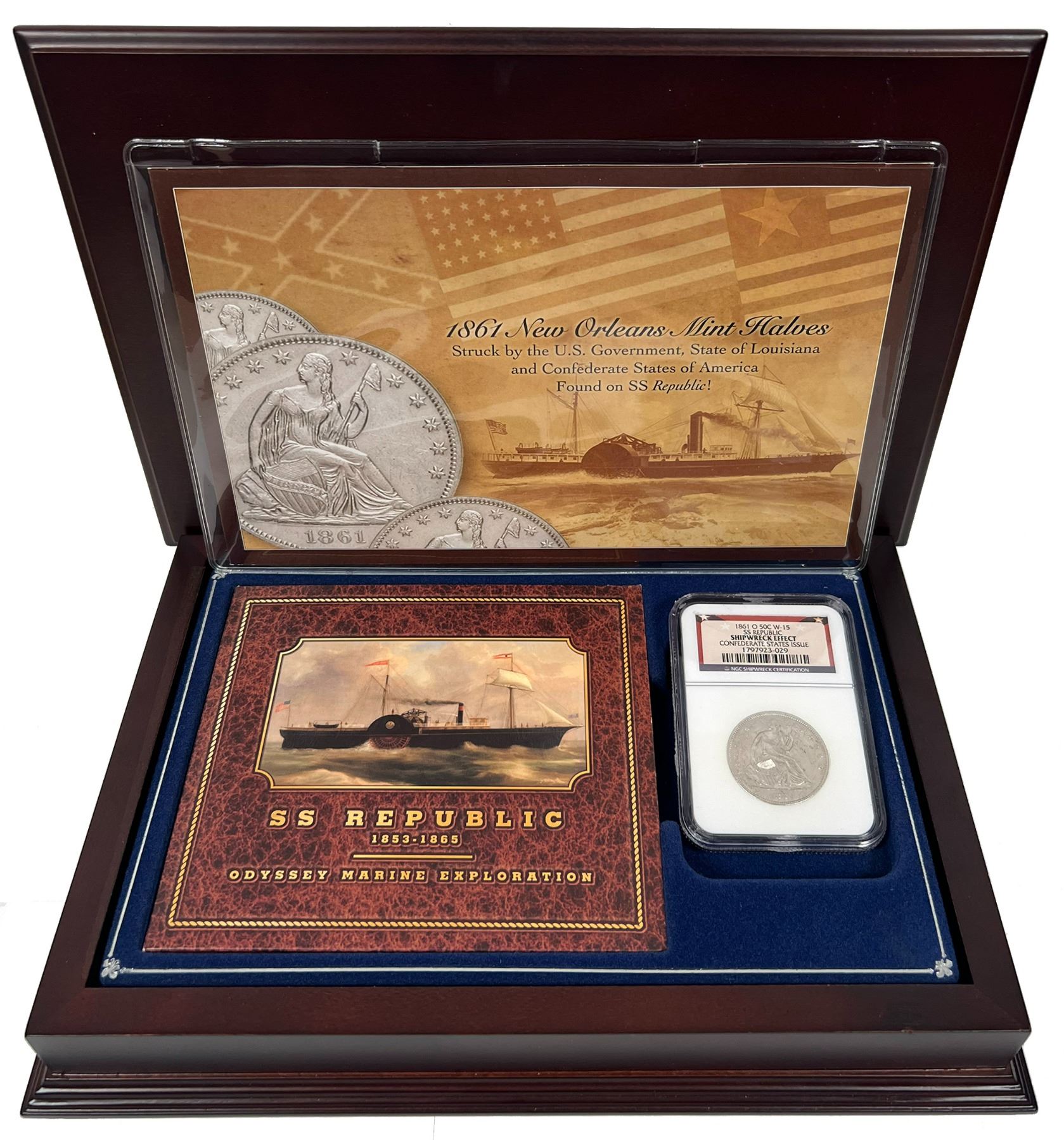 UNITED STATES, New Orleans mint, Seated Liberty half dollar, 1861-O, Confederate States issue (die W-15), speared olive bud variety, NGC Shipwreck Effect (SS Republic Shipwreck Label). Nice example of this popular type struck in spring of 1861 under the authority of the Confederate States of America using the captured New Orleans Mint equipment and federal silver. Lustrous Mint State with some small corrosion spots around the rims yet otherwise bright with sharp design details. With wooden display box and DVD documentary. Recovered from: S.S. Republic, sunk in 1865 off Georgia
