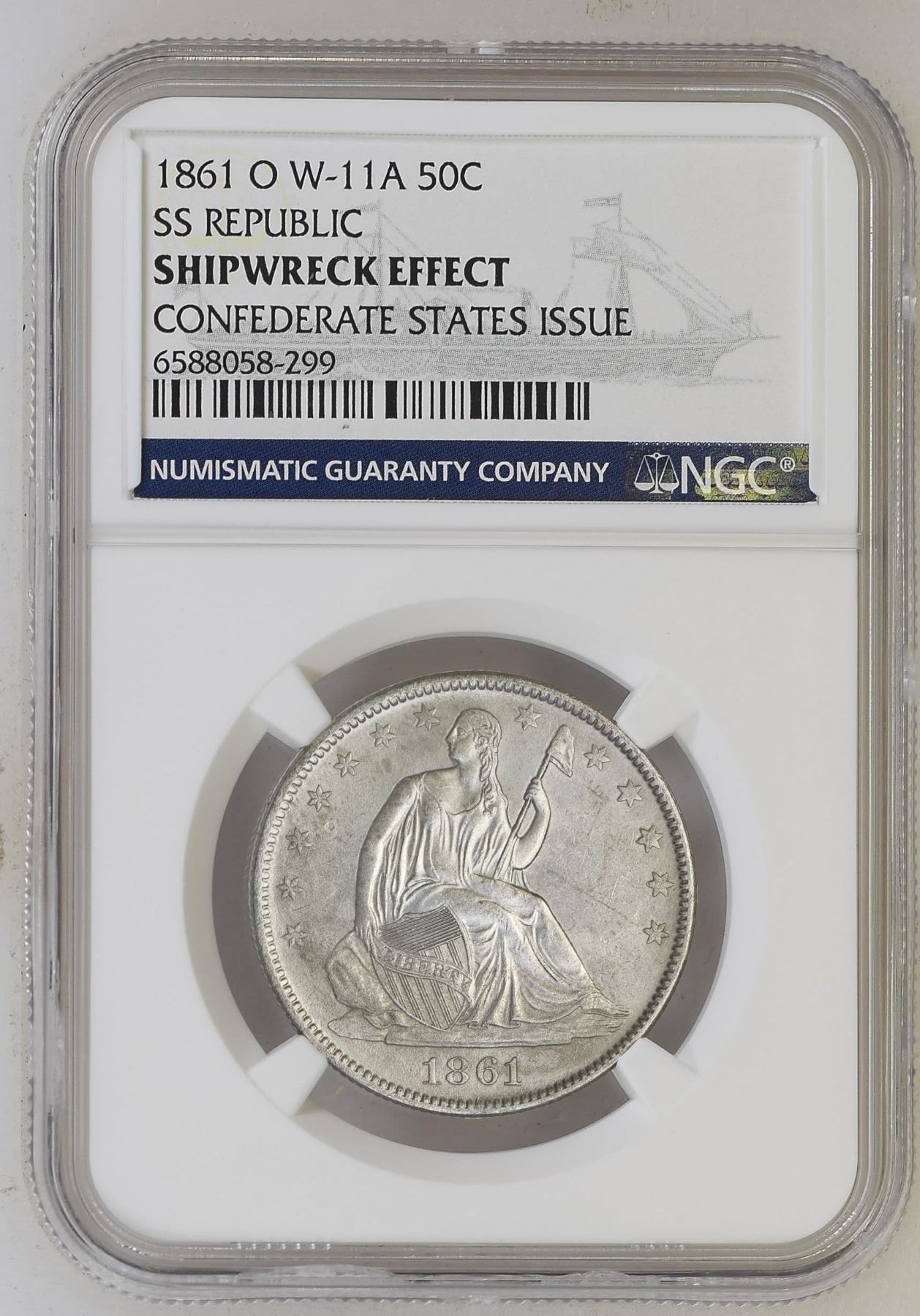 UNITED STATES, New Orleans mint, Seated Liberty half dollar, 1861-O, Confederate States issue (die W-13), NGC Shipwreck Effect (SS Republic Shipwreck Label). KM-A68. Struck by the authority of the Confederate States Treasury Department from March 21, 1861, until the supply of captured Federal silver ran out in April 1861. Mint State with some retained luster, surfaces lightly corroded. Recovered from: S.S. Republic, sunk in 1865 off Georgia