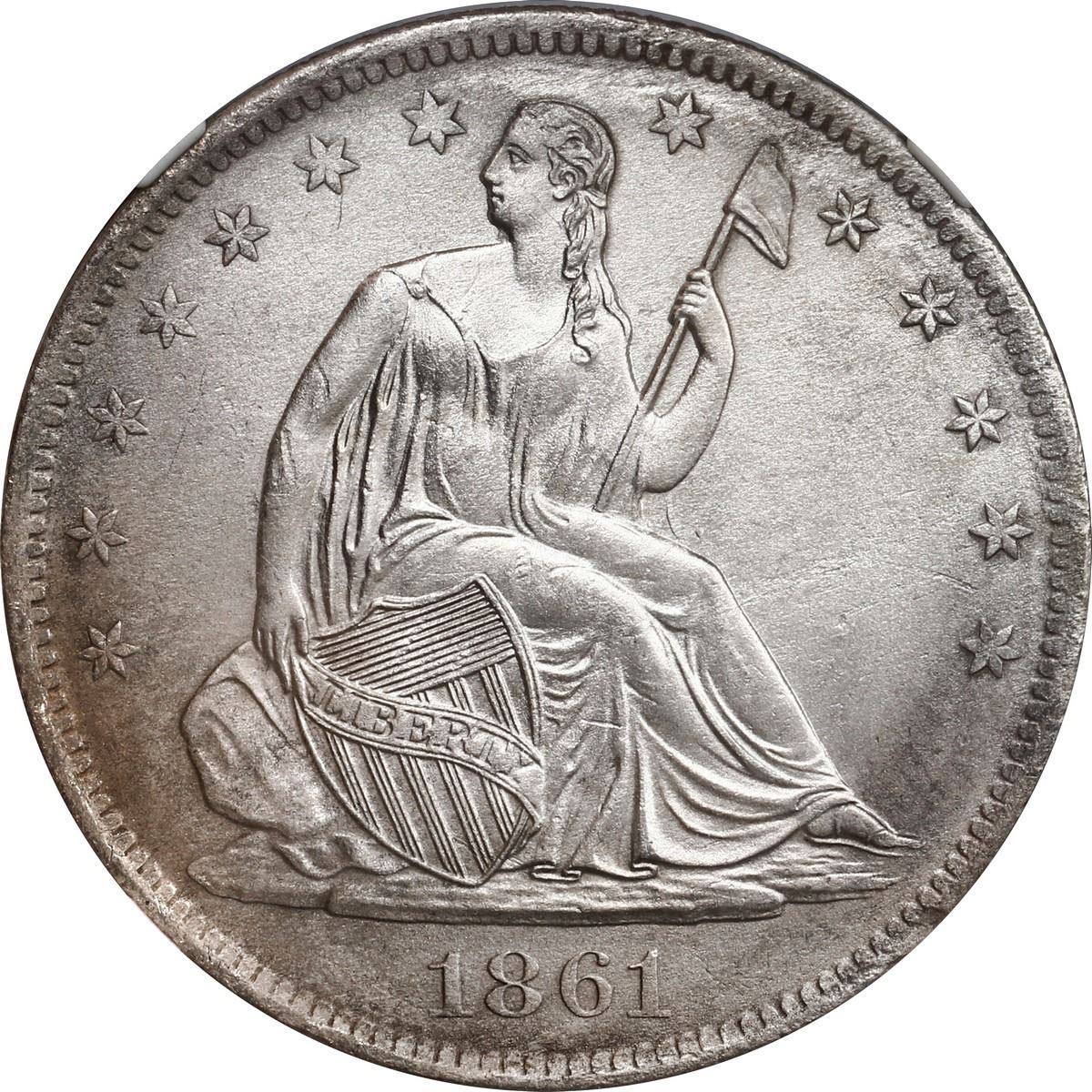 UNITED STATES, New Orleans mint, Seated Liberty half dollar, 1861-O, Confederate States issue (die W-15), speared olive bud variety, NGC Shipwreck Effect (SS Republic Shipwreck Label). KM-A68. Struck by the authority of the Confederate States Treasury Department from March 21, 1861, until the supply of captured Federal silver ran out in April 1861. Semi-lustrous Mint State piece with some areas of dark gray matte surfaces from corrosion, otherwise quite sharp in detail. Recovered from: S.S. Republic, sunk in 1865 off Georgia