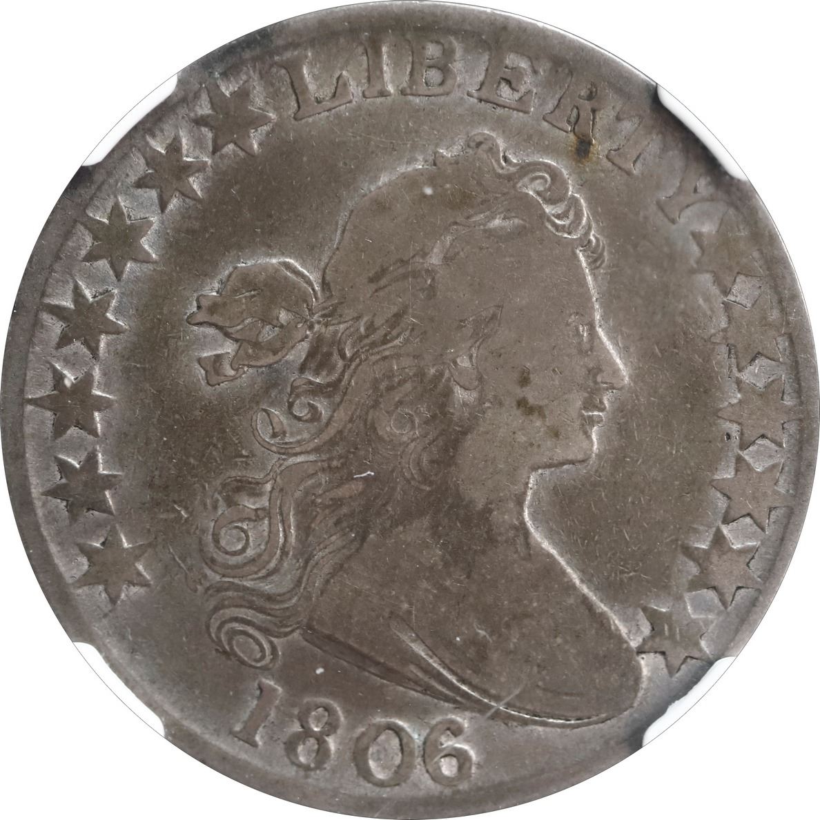 UNITED STATES, Philadelphia mint, Draped Bust half dollar, 1806/5, O-103, T-8, R.2, NGC VG 10, ex-Griggs Brothers Collection. Dark gray-toned surfaces with hints of luster around the legends, bold date showing off the 6/5 overdate digit. Pedigreed to the Griggs Brothers Collection (stated on label).